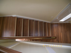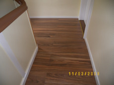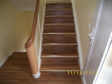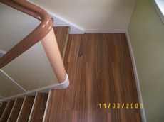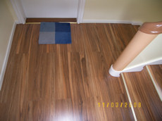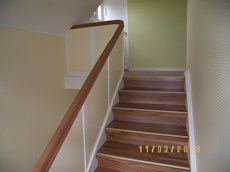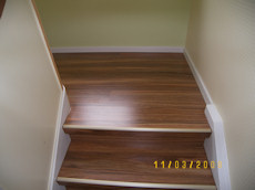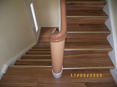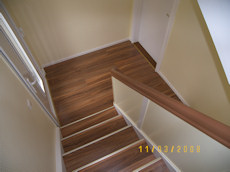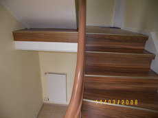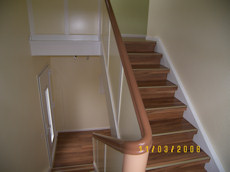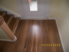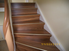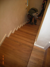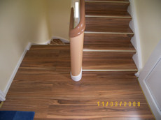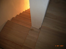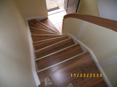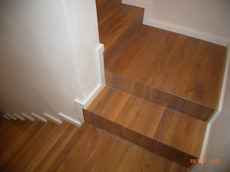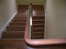Eigenheim Köpenick Fertigparkett Landhausdiele amerikanischer Nussbaum auf Tritt- und Setzstufe mit speziellen Treppenschinenen: